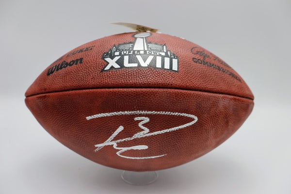 This is a superbowl 48 football signed by star QB Russell Wilson. Beckett COA. Wilson is a super bowl champion with the Seahawks he was traded to the Broncos in the 2022 off season. His career accomplishments include nine pro bowls and a superbowl and he also holds the record for QB's with the most wins in their first nine seasons with 98.