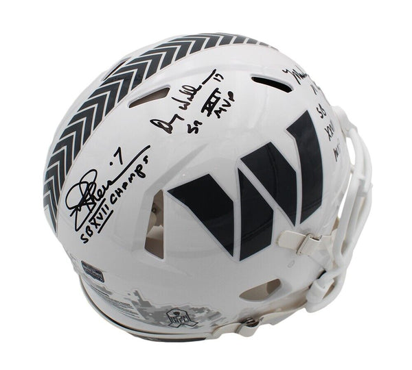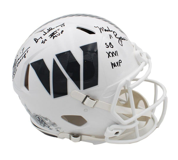 A Washington Commanders Speed Authentic Salute to Service 3 NFL Helmet hand signed by Mark Rypien, Doug Williams, and Joe Theismann. The item and signatures are in excellent condition. In addition to signing Their names, they also inscribed "SB XXVI MVP", "SB XVII MVP", and "SB XXII Champs" on the item. Mark is a 2x Pro Bowler, AP Second-Team All-Pro, 2x Super Bowl Champion, and the first Canadian-born quarterback to start in the NFL. Doug is a former quarterback who played for the Tampa Bay Buccaneers and for Washington Football Team. He is a Super Bowl Champion and Super Bowl MVP. Joe Theismann is a former NFL Quarterback. He played 12 seasons with the Washington Commanders. He is a Super Bowl XVII Champion, 1983 NFL MVP, 2x Pro Bowler, 1983 NFL Offensive Player of the Year. AUTHENTICATION: The item has been tagged with a SmarTag powered by Prova Technology, which gives you digital access to the items authentication records, including a proof picture from the signing.
