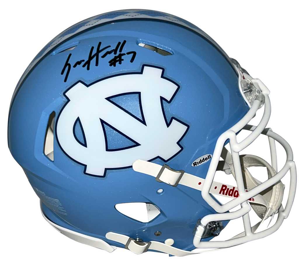 Sam Howell, star quarterback for the Tar Heels, has hand signed this North Carolina Riddell Speed full-size authentic helmet at a private signing. This helmet is fully padded inside like the ones worn on the field. This item is authenticated by Beckett Authentication Services and was signed in the presence of one of their representatives. Their tamper-evident hologram featuring a QR code and serial number is on the item. The authenticity can be verified online by entering the serial number or scanning the QR code.Item pictured may not be the exact item you will receive. It will be similar quality, and we guarantee your satisfaction.