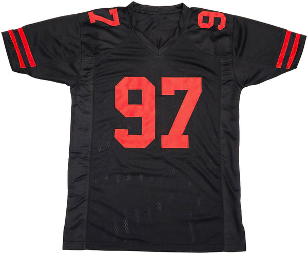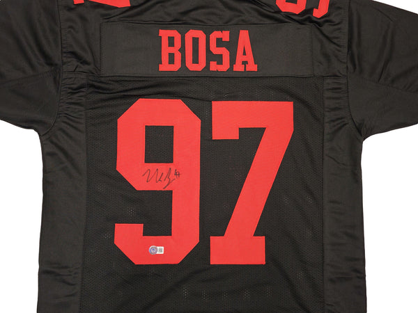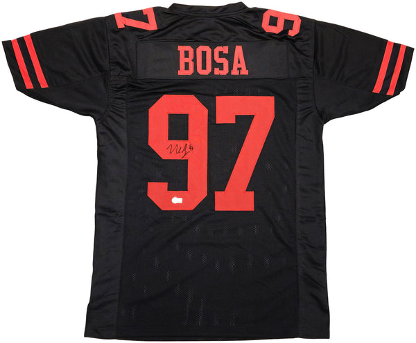 This is a Black Jersey that has been hand signed by Nick Bosa. This is a custom jersey with no name brand. The approximate size is XL. It has nice sewn in name and numbers. This item has been witnessed and certified authentic by Beckett Authentication (BAS) and comes with their tamper-proof witness sticker.