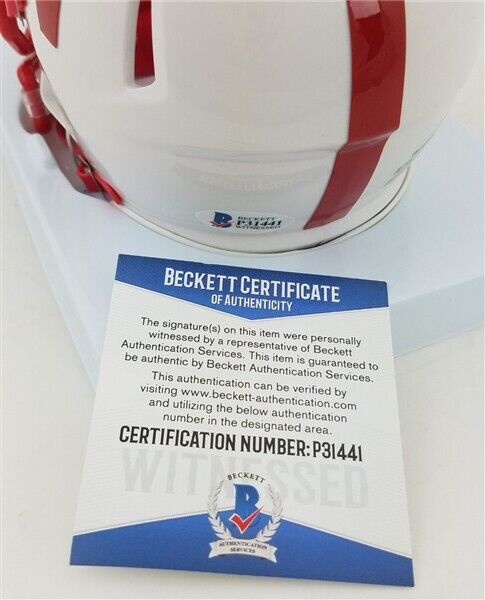 This autographed Riddell Speed mini helmet has been personally hand-signed by Scott Frost of the Nebraska Cornhuskers. This autograph is certified by Beckett Authentication Services (BAS) Witness Certification. That means that a Beckett representative was present when this item was signed. It comes with the numbered authentication hologram and matching Certificate of Authenticity.