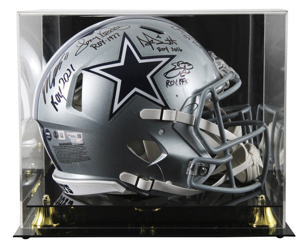 This Autographed Riddell Full Size Speed Proline Helmet W/ Uv Mirrored Back Acrylic Display Case with the inscription of "ROY 2016 (Prescott), ROY 1990 (Smith), ROY 2021 (Parsons), ROY 1977 (Dorsett), ROY 1969 (Hill)" has been Personally Signed by Dak Prescott, Emmitt Smith, Micah Parsons, Tony Dorsett & Calvin Hill of the Dallas Cowboys. This item is 100% Authentic to include a hologram by Beckett Authentication Services. This item will come with an affixed Beckett Authentication Services (BAS) authentication sticker, which includes a scannable QR code to verify authenticity. Please note that Beckett no longer provides serial-numbered COA cards, and the attached BAS sticker will serve as the complete authentication for this item. This is a BAS Witnessed Protection Program item which means a Beckett Authentication Service representative was present when this item was being signed. We conducted an autograph signing with Dak Prescott, Emmitt Smith, Micah Parsons, Tony Dorsett & Calvin Hill where multiples of the same item were signed. While the photographs are representative of this item, the size, placement and strength of the signature may vary. Each item is hand signed, therefore, each autograph is unique. This item can be verified through BAS Witnessed.