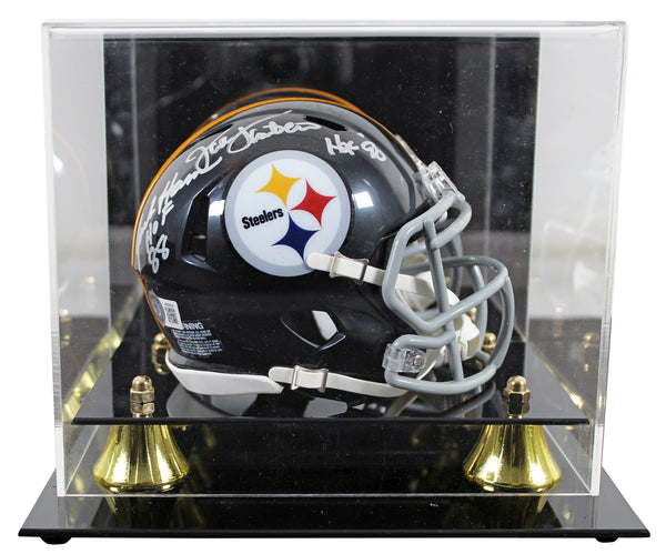 This Autographed Speed Mini Helmet W/ Uv Mirrored Back Acrylic Display Case with the inscription of "HOF 90 (Lambert), HOF 88 (Ham)" has been Personally Signed by Jack Ham & Jack Lambert of the Pittsburgh Steelers. This item is 100% Authentic to include a hologram by Beckett Authentication Services. This item will come with an affixed Beckett Authentication Services (BAS) authentication sticker, which includes a scannable QR code to verify authenticity. Please note that Beckett no longer provides serial-numbered COA cards, and the attached BAS sticker will serve as the complete authentication for this item. This is a BAS Witnessed Protection Program item which means a Beckett Authentication Service representative was present when this item was being signed. We conducted an autograph signing with Jack Ham & Jack Lambert where multiples of the same item were signed. While the photographs are representative of this item, the size, placement and strength of the signature may vary. Each item is hand signed, therefore, each autograph is unique. This item can be verified through BAS Witnessed.
