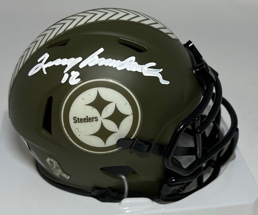 NFL SALUTE TO SERVICE Speed Mini Helmet hand signed by Pittsburgh Steelers Hall of Famer TERRY BRADSHAW. The signature is in White paint pen. This item was signed at a private signing with us and would make a great addition to any STEELERS collection! This autograph is guaranteed to be 100% authentic and will include a COA hologram from Beckett Authentication.