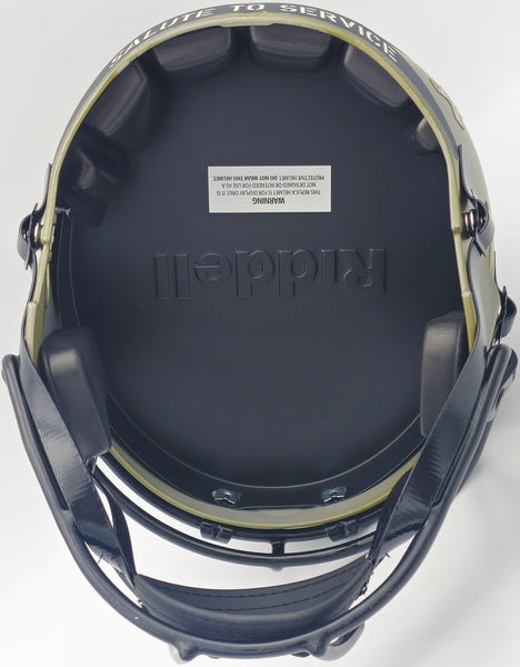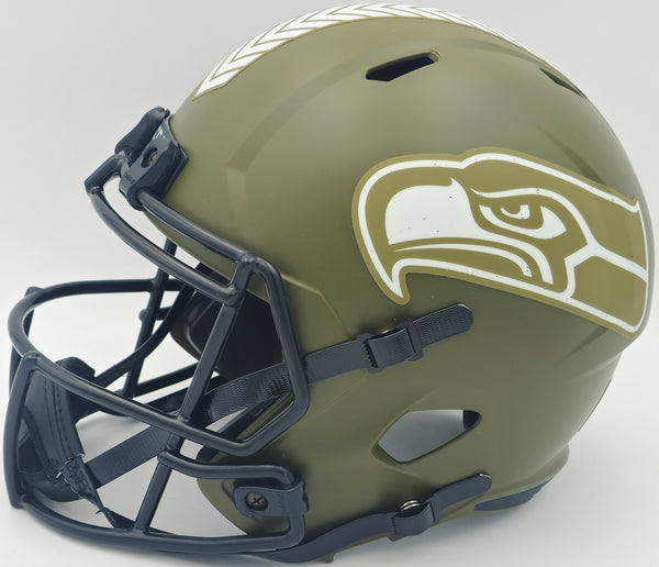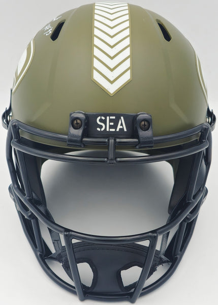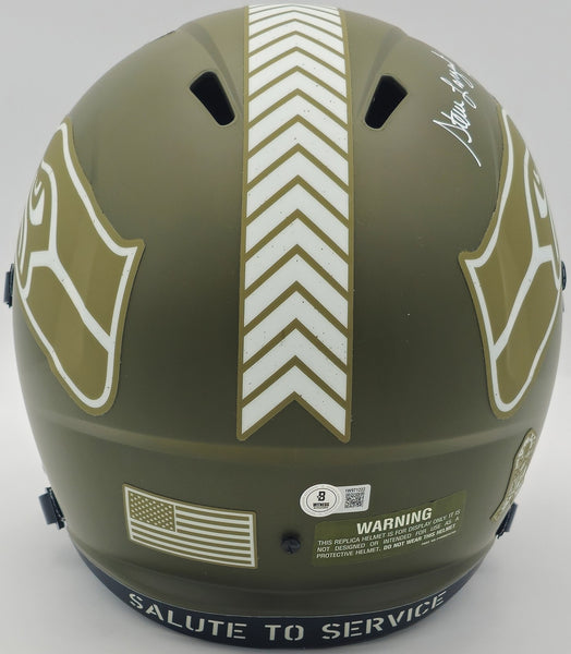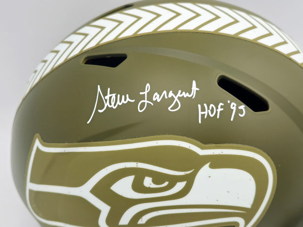 This is a Seattle Seahawks Camo Green Full Size Speed Replica Salute to Service Helmet that has been hand signed by Steve Largent. Because each Camo helmet is hand-dipped using water-transfer technology there may be slight imperfections. This item was inscribed "HOF 95." This item has been witnessed and certified authentic by Beckett Authentication (BAS) and comes with their tamper-proof witness hologram.