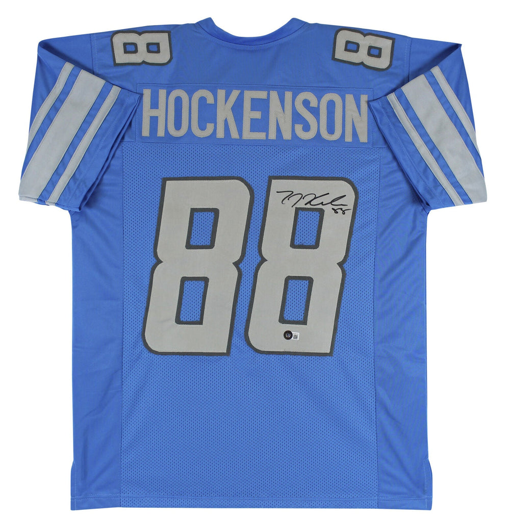This Autographed Blue Pro Style Jersey has been Personally Signed by T.J. Hockenson of the Detroit Lions. This item is 100% Authentic to include a hologram by Beckett Authentication Services. This item will come with the new Beckett Authentication hologram that has a scannable QR code rather than the traditional COA. If you would like to have a COA, you are welcome to reach out to Beckett for a printed certification once you receive your item. This is a BAS Witnessed Protection Program item which means a Beckett Authentication Service representative was present when this item was being signed. This is a stock item. We conducted an autograph signing with T.J. Hockenson and we have several of these available. The one you will receive will be of equal quality to the one pictured. This item can be verified through BAS Witnessed. This is a X-Large sized, non-branded, custom-stitched Jersey.