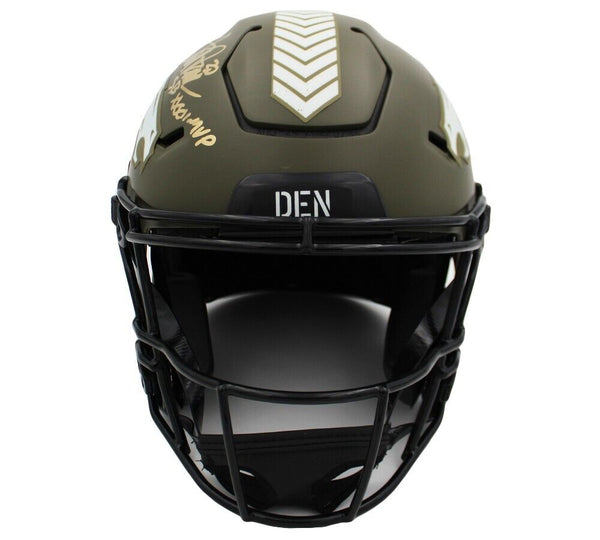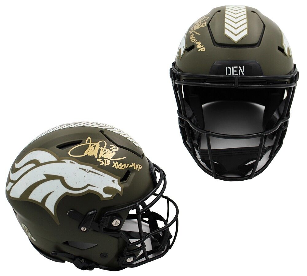 A Denver Broncos Speed Flex Authentic Salute To Service NFL Helmet hand signed by Terrell Davis. The item and signature are in excellent condition. In addition to signing his name, Terrell inscribed "SB XXXII MVP" on the item. Terrell is a former NFL running back. He was drafted 6th round in the 1995 NFL Draft by the Denver Broncos. 2x Super Bowl Champion, Super Bowl XXXII MVP, 3x Pro Bowler, 3x First-Team All-Pro, 1998 NFL MVP. AUTHENTICATION: The item is accompanied by a Terrell Davis Exclusive Certificate of Authenticity, Terrell Davis Exclusive Serial Numbered and Databased Hologram, Picture of Terrell from the Signing