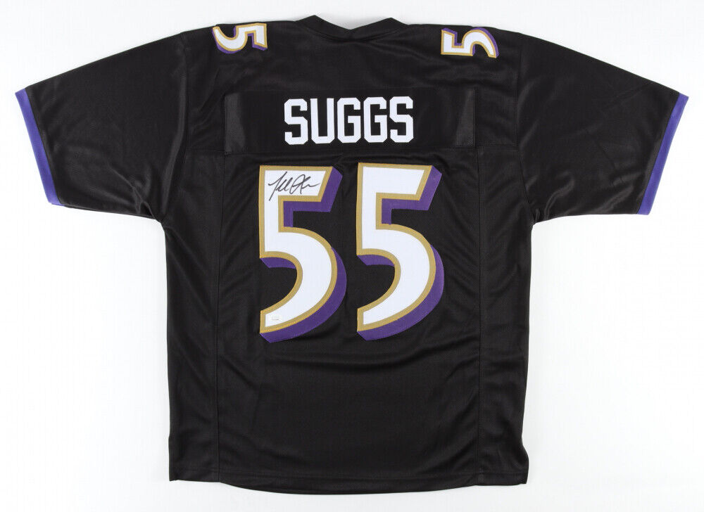 Custom on-field style jersey. Everything is sewn on, size XL. Hand-signed in black Sharpie pen by Terrell Suggs. The lot / autograph(s) includes an official James Spence Authentication (JSA) hologram and matching COA for authenticity purposes. The signing of this item was witnessed by JSA.Authentication: JSA COA
