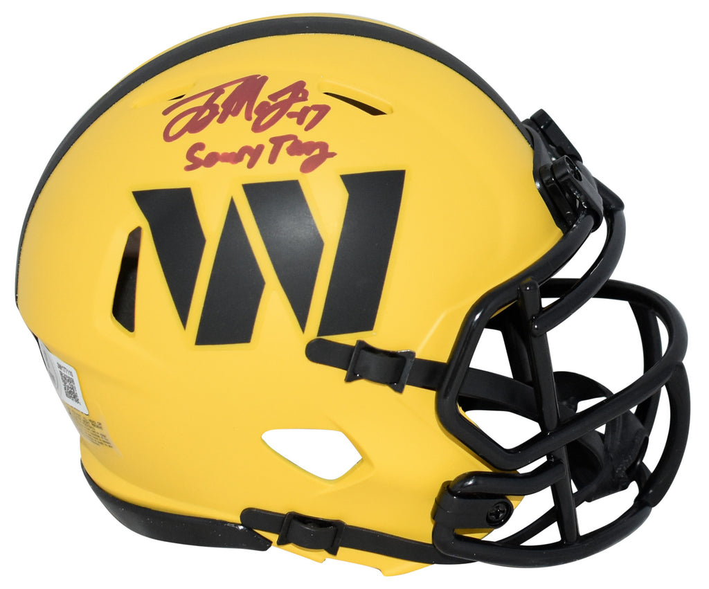Terry McLaurin, star wide receiver for the Washington Commanders, has hand signed this Commanders Riddell Speed Rave mini helmet at a private signing. He included the inscription "Scary Terry" with his signature. This item is authenticated by Beckett Authentication Services and was signed in the presence of one of their representatives. Their tamper-evident hologram featuring a QR code and serial number is on the item. The authenticity can be verified online by entering the serial number or scanning the QR code.Item pictured may not be the exact item you will receive. It will be similar quality, and we guarantee your satisfaction.