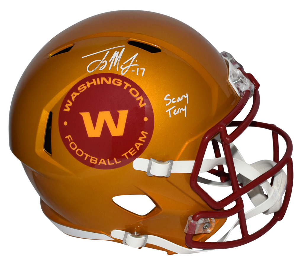 Terry McLaurin, Pro Bowl wide receiver for the Washington Commanders, has hand signed this WFT Riddell Speed Flash full-size replica helmet at a private signing. He included the inscription "Scary Terry" with his signature. This item is authenticated by Beckett Authentication Services, one of the best authenticators in the industry. Their tamper-evident hologram featuring a QR code and serial number is on the item. The authenticity can be verified online by entering the serial number or scanning the QR code.Item pictured may not be the exact item you will receive. It will be similar quality, and we guarantee your satisfaction.