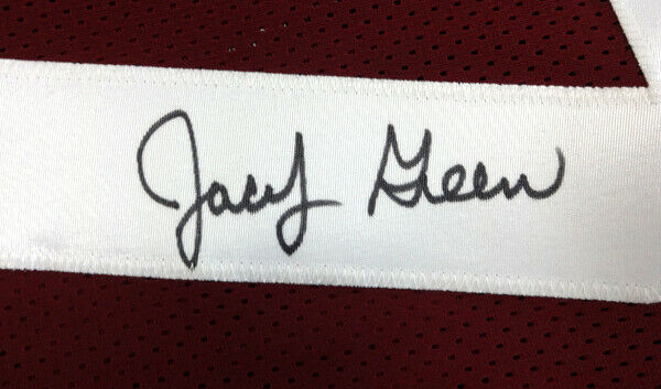This is a Maroon Custom Jersey that has been hand signed by Jacob Green. This is a custom jersey with no name brand. The approximate size is XL. It has nice sewn in name and numbers. This item was signed in the presence of a Mill Creek Sports representative and comes with their serial numbered hologram and matching certificate of authenticity.