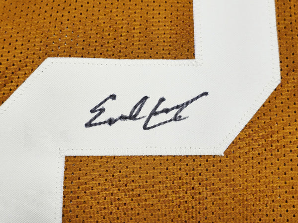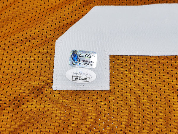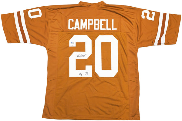 This is an Orange Jersey that has been hand signed by Earl Campbell. This is a custom jersey with no name brand. The approximate size is XL. It has nice sewn in name and numbers. This item was inscribed "HT 77." This item has been certified authentic by JSA and comes with their tamper-proof sticker and matching certificate of authenticity.