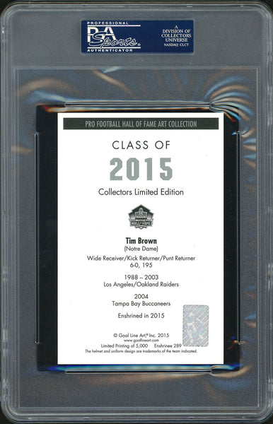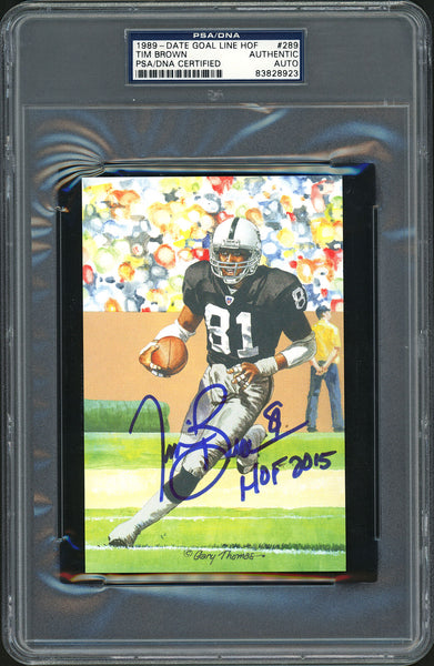 This is a Goal Line Art Postcard #289 that has been hand signed by Tim Brown. Along with the autograph, this item also comes with the inscription which reads "HOF 2015". This item has been certified authentic by PSA/DNA and comes encapsulated in their tamper-proof holder for authenticity.