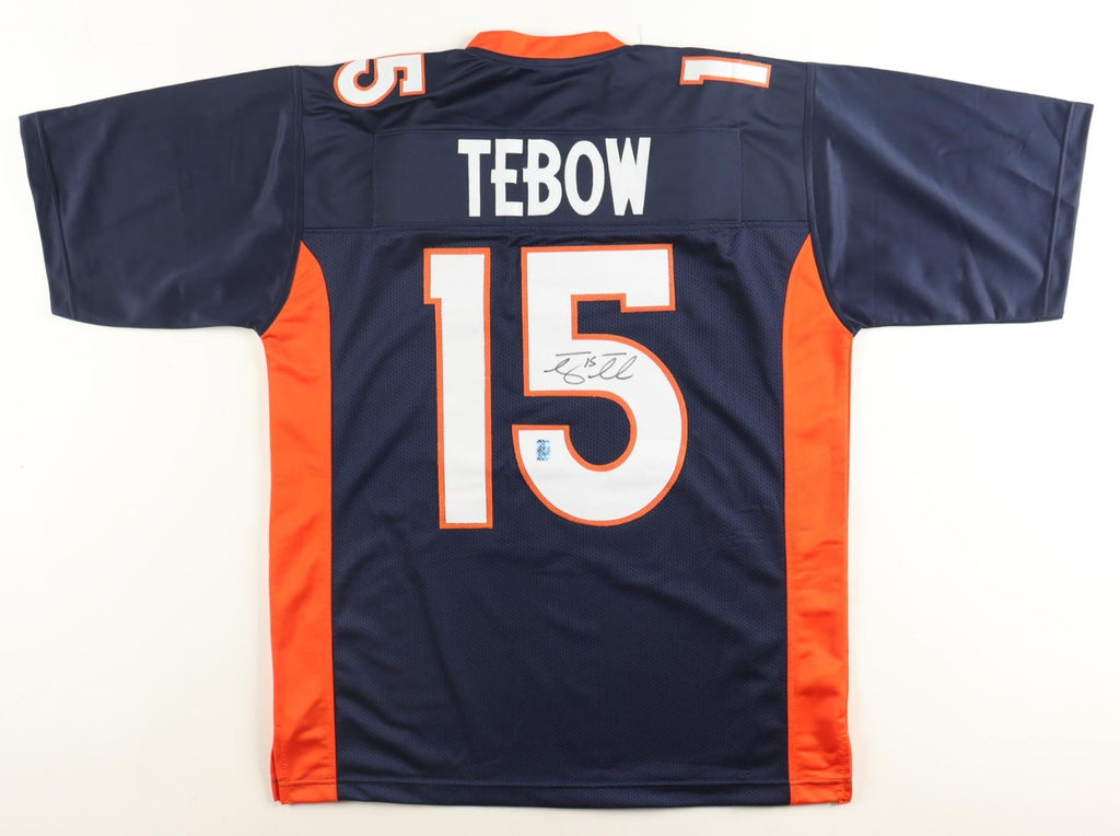 Custom on-field style jersey. Everything is sewn on, size Adult XL. Hand-signed by Tim Tebow. The autograph includes an official Tim Tebow player hologram for authenticity purposes.Authentication: Tebow Player Hologram