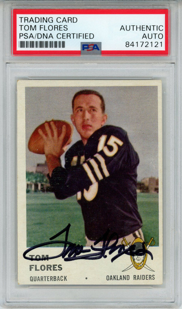 Tom Flores Autographed 1961 Fleer #188 Trading Card HOF PSA Slab 43629 The number in the listing title is just an inventory sku for our records and is not the authentication number. This is the exact item that you will receive so please see pictures for condition. This is a trading card that was personally autographed by Tom Flores. This has been professionally slabbed by Professional Authentication Services (PSA) and includes a certificate of authenticity from Denver Autographs.
