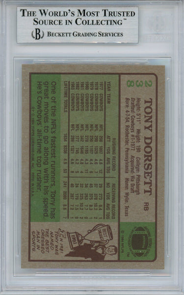 Tony Dorsett Autographed 1984 Topps #238 Trading Card Beckett Slab 34025 The number in the listing title is just an inventory sku for our records and is not the authentication number. The item pictured is a stock photo unless otherwise noted. This is a trading card that was personally autographed by Tony Dorsett. This has been professionally slabbed by Beckett Authentication Services (BAS) and includes a certificate of authenticity from Denver Autographs.
