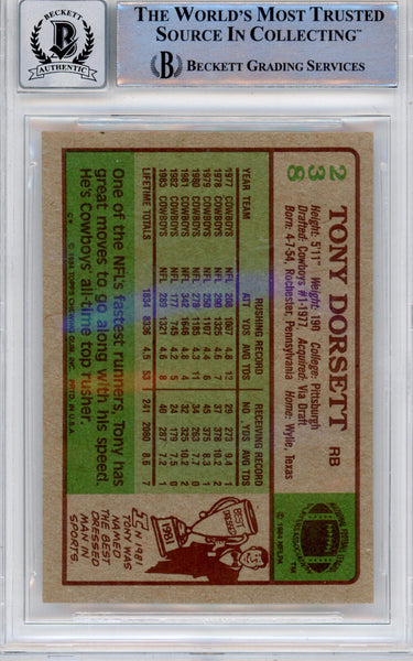 Tony Dorsett Autographed 1984 Topps #238 Trading Card Beckett Slab 39205 The number in the listing title is just an inventory sku for our records and is not the authentication number. This is the exact item that you will receive so please see scans for condition. This is a trading card that was personally autographed by Tony Dorsett. This has been professionally slabbed by Beckett Authentication Services (BAS) and includes a certificate of authenticity from Denver Autographs.