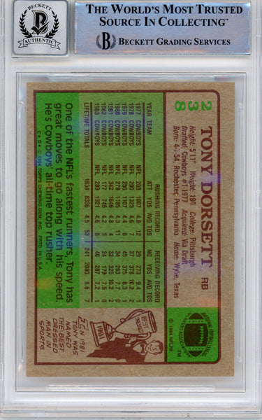 Tony Dorsett Autographed 1984 Topps #238 Trading Card Beckett Slab 39214 The number in the listing title is just an inventory sku for our records and is not the authentication number. This is the exact item that you will receive so please see scans for condition. This is a trading card that was personally autographed by Tony Dorsett. This has been professionally slabbed by Beckett Authentication Services (BAS) and includes a certificate of authenticity from Denver Autographs.
