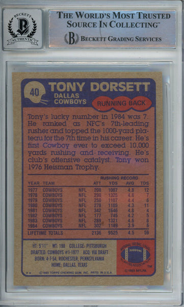 Tony Dorsett Autographed 1985 Topps #40 Trading Card Beckett 10 Slab 39233 The number in the listing title is just an inventory sku for our records and is not the authentication number. This is the exact item that you will receive so please pictures for condition. This is a trading card that was personally autographed by Tony Dorsett. This has been professionally slabbed by Beckett Authentication Services (BAS) and includes a certificate of authenticity from Denver Autographs.