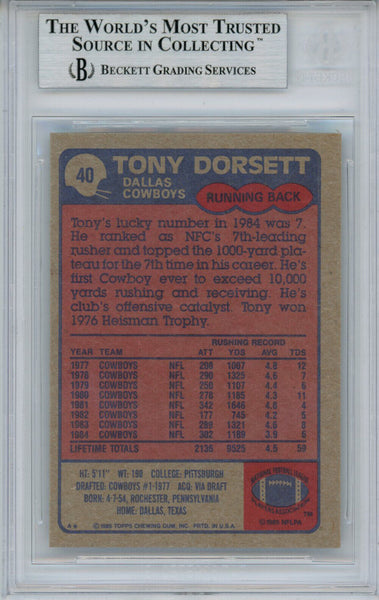 Tony Dorsett Autographed 1985 Topps #40 Trading Card Beckett Slab 34026 The number in the listing title is just an inventory sku for our records and is not the authentication number. The item pictured is a stock photo unless otherwise noted. This is a trading card that was personally autographed by Tony Dorsett. This has been professionally slabbed by Beckett Authentication Services (BAS) and includes a certificate of authenticity from Denver Autographs.