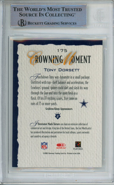 Tony Dorsett Autographed 2002 Gridiron Kings #175 Trading Card BAS Slab 38660 The number in the listing title is just an inventory sku for our records and is not the authentication number. The item pictured is a stock photo unless otherwise noted. This is a trading card that was personally autographed by Tony Dorsett. This has been professionally slabbed by Beckett Authentication Services (BAS) and includes a certificate of authenticity from Denver Autographs.