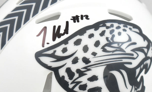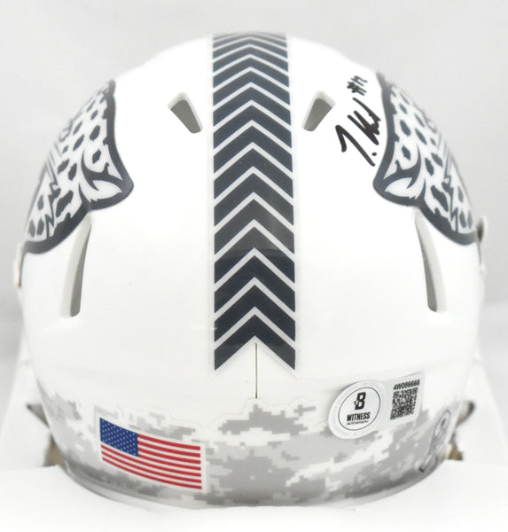 This is a hand autograph of Travis Hunter of the Jacksonville Jaguars on a Riddell Football Salute to Service 2024 Speed Mini Helmet. This item has a Beckett Witnessed Authentication, which comes with a numbered hologram and a QR code for verification. You can view this item on the Beckett Authentication website, and it shows when and where the item was signed. It was signed either at a public autograph appearance or a private signing. This is a stock photo of the item. Although you may not receive this exact item, the item you receive is virtually identical and brand new in great shape. This is a hand autograph of Travis Hunter of the Jacksonville Jaguars on a Riddell Football Salute to Service 2024 Speed Mini Helmet. This item has a Beckett Witnessed Authentication, which comes with a numbered hologram and a QR code for verification. You can view this item on the Beckett Authentication website, and it shows when and where the item was signed. It was signed either at a public autograph appearance or a private signing. This is a stock photo of the item. Although you may not receive this exact item, the item you receive is virtually identical and brand new in great shape.