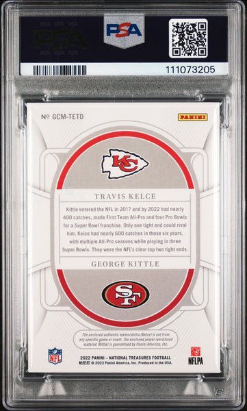 This Autographed Card Graded Mint 9! Auto Graded Mint 9! 2022 National Treasures NFL Gear Combo Materials #TETD #13/99 Card has been Personally Signed by Travis Kelce & George Kittle. This item is 100% Authentic, it comes slabbed and authenticated by PSA/DNA. The authenticity can be verified on Professional Sports Authenticator website.