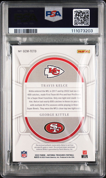 This Autographed Card Graded Mint 9! Auto Graded Mint 9! 2022 National Treasures NFL Gear Combo Materials #TETD #28/99 Card has been Personally Signed by Travis Kelce & George Kittle. This item is 100% Authentic, it comes slabbed and authenticated by PSA/DNA. The authenticity can be verified on Professional Sports Authenticator website.