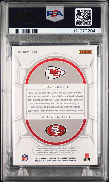 This Autographed Card Graded Mint 9! Auto Graded Gem Mint 10! 2022 National Treasures NFL Gear Combo Materials #TETD #88/99 Card has been Personally Signed by Travis Kelce & George Kittle. This item is 100% Authentic, it comes slabbed and authenticated by PSA/DNA. The authenticity can be verified on Professional Sports Authenticator website.