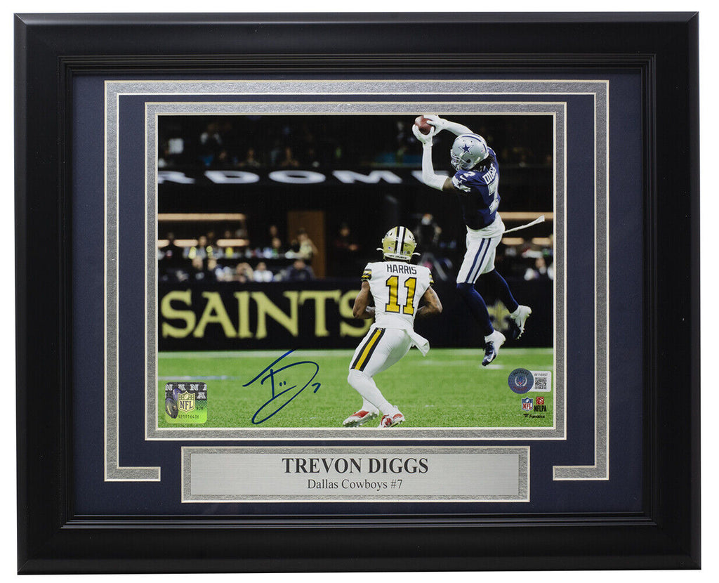 Featured is a Trevon Diggs signed framed 8x10 Dallas Cowboys football photo. This photo was hand signed by Trevon Diggs. and authenticated by Beckett authentication services. Included with the photo is a Beckett hologram and certificate of authenticity. Brand new professional framing featuring double matting and engraved nameplate. The frame measures approximately 14x11 in total size, and it is ready for display. This item would make a great addition to any sports memorabilia collection.. SPECIFICATIONS Autographed By: Trevon Diggs Team: Dallas Cowboys Sport: Football Authentication: Beckett Grading Services