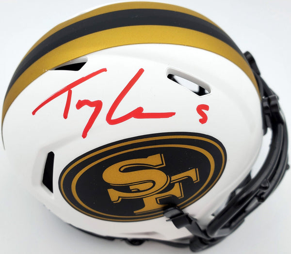 This is a San Francisco 49ers Lunar Eclipse White Speed Mini Helmet that has been hand signed by Trey Lance. The Eclipse helmets are very delicate and often have some marks or scratches on them. This item has been certified authentic by Beckett Authentication (BAS) and comes with their tamper-proof QR Code sticker that can be verified on the Beckett-authentication.com.