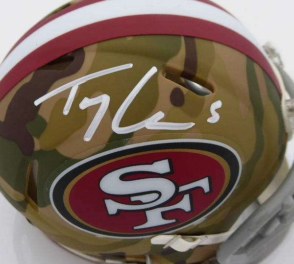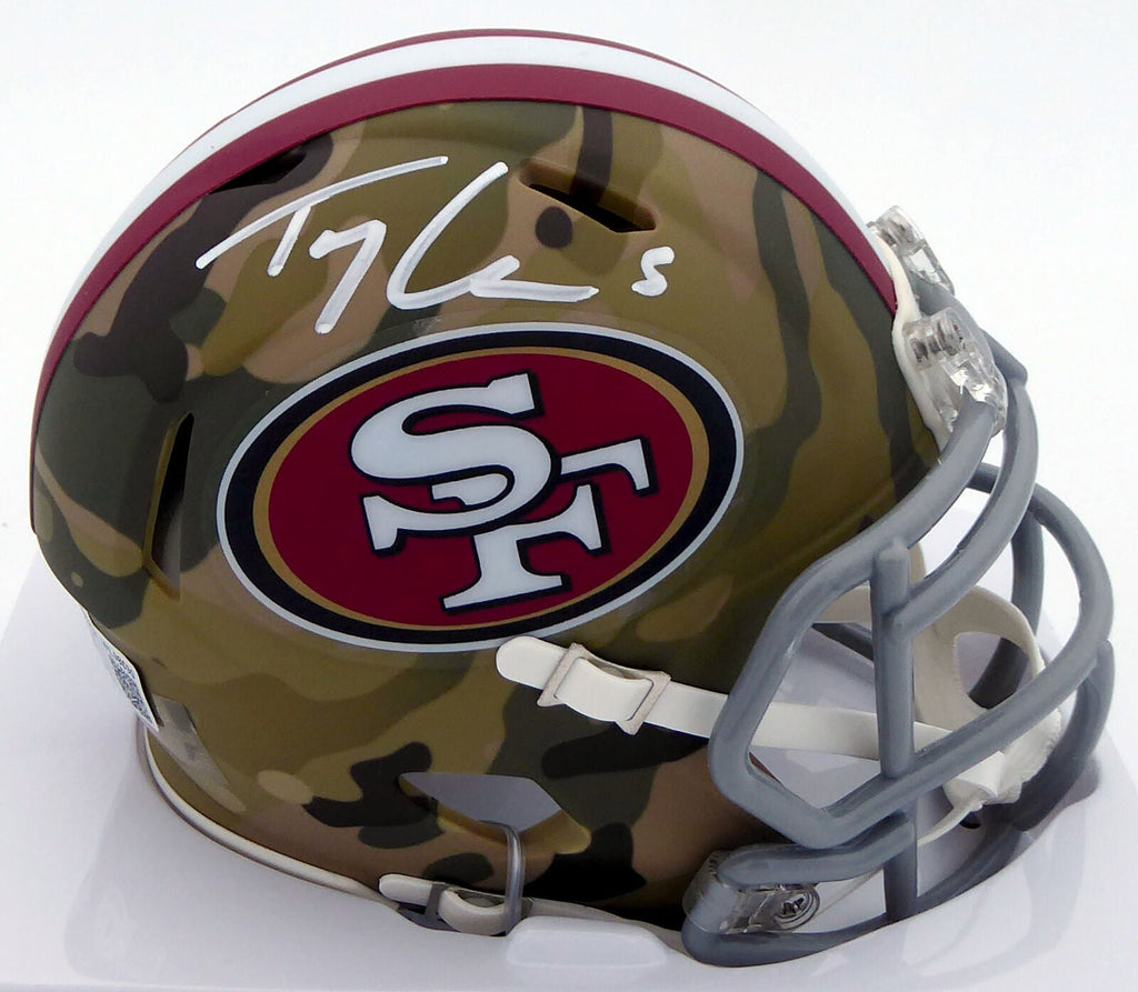 This is a San Francisco 49ers Camo Speed Mini Helmet that has been hand signed by Trey Lance. Because each Camo helmet is hand-dipped using water-transfer technology there may be slight imperfections. This item has been certified authentic by Beckett Authentication (BAS) and comes with their tamper-proof QR Code sticker that can be verified on the Beckett-authentication.com.