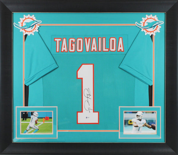 This Autographed Teal Pro Style Framed Jersey has been Personally Signed by Tua Tagovailoa of the Miami Dolphins. This item is 100% Authentic to include a Certificate of Authenticity (COA) / hologram by Beckett Authentication Services. We have multiples of this same item. While the photographs are representative of this item, the size, placement and strength of the signature may vary. Each item is hand signed, therefore, each autograph is unique. This item has been professionally framed to overall dimensions of approximately 32 x 37 inches. This is a X-Large sized, non-branded, custom-stitched Framed Jersey. This jersey will be framed to order, it will take approximately 3-4 business days from purchase date for it to ship.