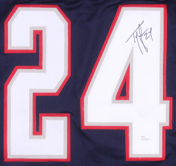 Ty Law Signed New England Patriots Blue Jersey (JSA COA) 3xSuper Bowl Champion