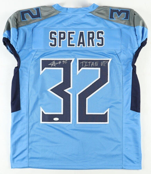 Custom jersey, everything is sewn on, size XL. Hand-signed and inscribed "TITAN UP" by Tyjae Spears.The autograph(s) includes an official James Spence Authentication (JSA) "Signature Debut" hologram and COA. "Signature Debut" is the autographed memorabilia equivalent to a rookie card. The JSA definition of a "Signature Debut" is as follows: "Any item that is autographed and received by JSA prior to the last game of the signer's official rookie season.Authentication: JSA COA