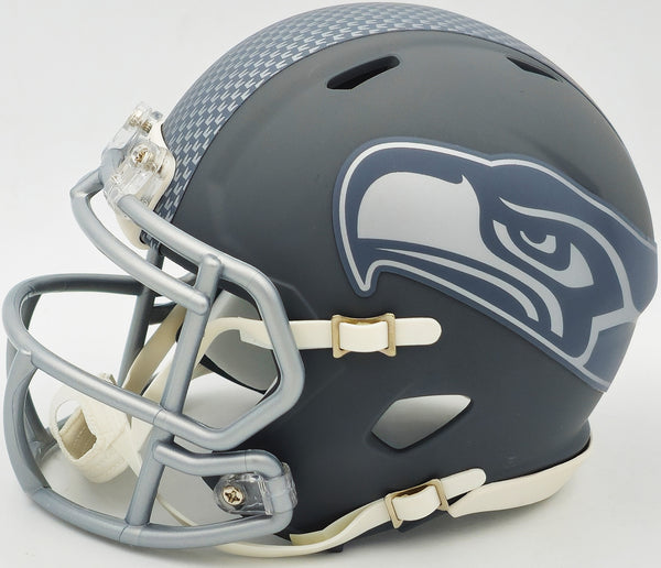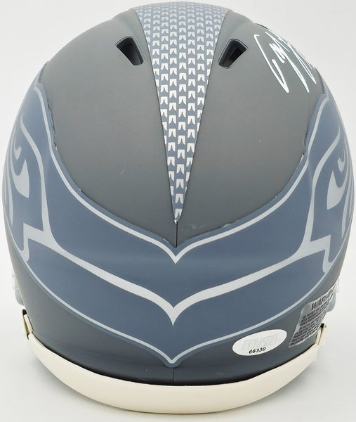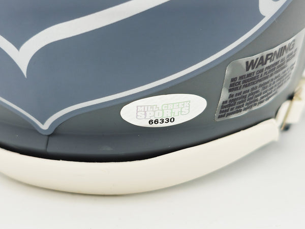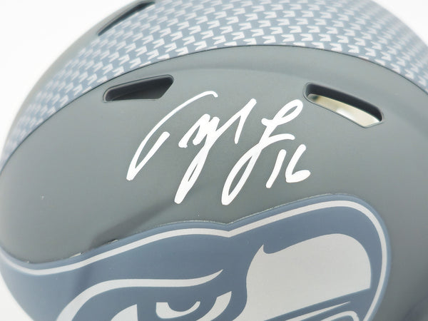 This is a Seattle Seahawks Slate Gray Speed Mini Helmet that has been hand signed by Tyler Lockett. This item was signed in the presence of a Mill Creek Sports representative and comes with their serial numbered hologram and matching certificate of authenticity.
