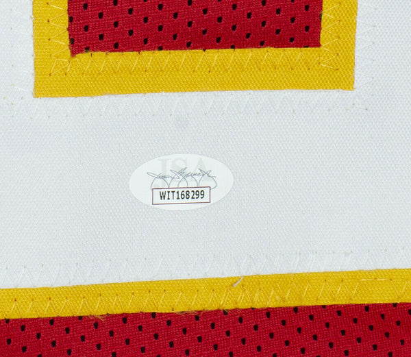 Featured is a Tyrann Mathieu signed custom red pro style football jersey. This jersey was hand signed by Tyrann Mathieu in the presence of a JSA authentication representative. Included with the jersey is a JSA witnessed hologram and certificate of authentication. This jersey would make a great addition to any sports memorabilia collection. This jersey has hand sewn numbers and letter and has NO logos or any affiliation with any manufacturer or team. It is simply intended as an autographed collectible.. SPECIFICATIONS Autographed By: Tyrann Mathieu Team: Kansas City Chiefs Sport: Football-NFL Authentication: James Spence Authentication (JSA)