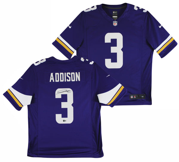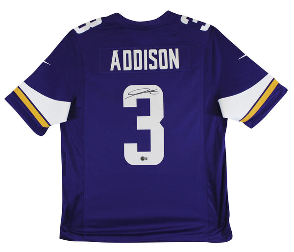 This Autographed Purple Nike Limited Jersey has been Personally Signed by Jordan Addison of the Minnesota Vikings. This item is 100% Authentic to include a hologram by Beckett Authentication Services. This item will come with an affixed Beckett Authentication Services (BAS) authentication sticker, which includes a scannable QR code to verify authenticity. Please note that Beckett no longer provides serial-numbered COA cards, and the attached BAS sticker will serve as the complete authentication for this item. This is a BAS Witnessed Protection Program item which means a Beckett Authentication Service representative was present when this item was being signed. We conducted an autograph signing with Jordan Addison where multiples of the same item were signed. While the photographs are representative of this item, the size, placement and strength of the signature may vary. Each item is hand signed, therefore, each autograph is unique. This item can be verified through BAS Witnessed. Multiple sizes available. Reach out for availability.