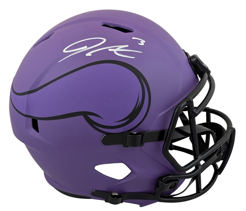 This Autographed Alternate Rave Riddell Full Size Speed Rep Helmet has been Personally Signed by Jordan Addison of the Minnesota Vikings. This item is 100% Authentic to include a hologram by Beckett Authentication Services. This item will come with an affixed Beckett Authentication Services (BAS) authentication sticker, which includes a scannable QR code to verify authenticity. Please note that Beckett no longer provides serial-numbered COA cards, and the attached BAS sticker will serve as the complete authentication for this item. This is a BAS Witnessed Protection Program item which means a Beckett Authentication Service representative was present when this item was being signed. We conducted an autograph signing with Jordan Addison where multiples of the same item were signed. While the photographs are representative of this item, the size, placement and strength of the signature may vary. Each item is hand signed, therefore, each autograph is unique. This item can be verified through BAS Witnessed.