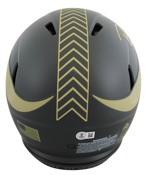 This Autographed Alternate 2025 Salute to Service IV Riddell Authentic Full Size Speed Proline Helmet has been Personally Signed by Randy Moss of the Minnesota Vikings. This item is 100% Authentic to include a hologram by Beckett Authentication Services. This item will come with an affixed Beckett Authentication Services (BAS) authentication sticker, which includes a scannable QR code to verify authenticity. Please note that Beckett no longer provides serial-numbered COA cards, and the attached BAS sticker will serve as the complete authentication for this item. This is a BAS Witnessed Protection Program item which means a Beckett Authentication Service representative was present when this item was being signed. We conducted an autograph signing with Randy Moss where multiples of the same item were signed. While the photographs are representative of this item, the size, placement and strength of the signature may vary. Each item is hand signed, therefore, each autograph is unique. This item can be verified through BAS Witnessed.