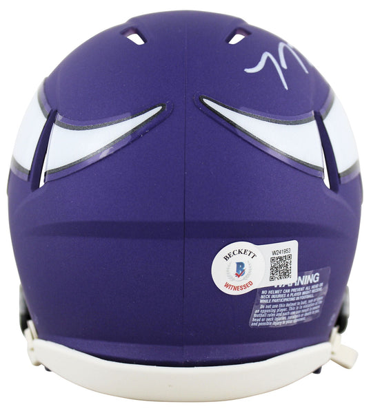 This Autographed Speed Mini Helmet has been Personally Signed by T.J. Hockenson of the Minnesota Vikings. This item is 100% Authentic to include a hologram by Beckett Authentication Services. This item will come with an affixed Beckett Authentication Services (BAS) authentication sticker, which includes a scannable QR code to verify authenticity. Please note that Beckett no longer provides serial-numbered COA cards, and the attached BAS sticker will serve as the complete authentication for this item. This is a BAS Witnessed Protection Program item which means a Beckett Authentication Service representative was present when this item was being signed. We conducted an autograph signing with T.J. Hockenson where multiples of the same item were signed. While the photographs are representative of this item, the size, placement and strength of the signature may vary. Each item is hand signed, therefore, each autograph is unique. This item can be verified through BAS Witnessed.