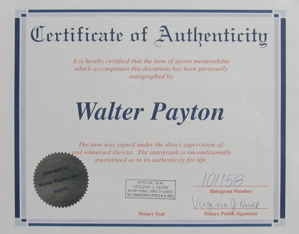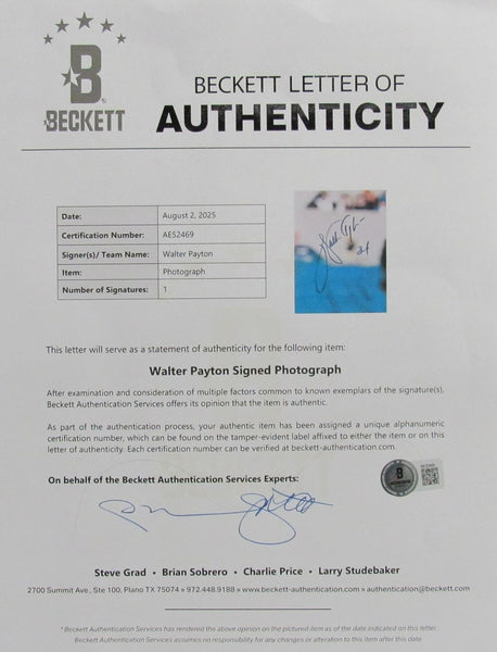 Walter Payton Signed/Autographed 16x20 Photo Chicago Bears Framed. The outer frame size is 26 inches x 22 inches. This photo is authenticated by BAS/Beckett and includes their tamper-proof hologram sticker and Letter of Authenticity.