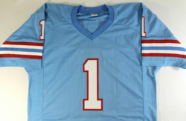 Custom on-field style jersey. Everything is sewn on, size XL. Hand-signed and inscribed in black paint pen by Warren Moon (HOF). The autograph includes an official G.T. Sports Marketing hologram for authenticity purposes.Authentication: G.T. Sports Marketing Hologram