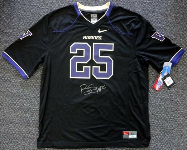 This is a Black Nike Washington Huskies Jersey that has been hand signed by Bishop Sankey. This one is size XL. This item was signed in the presence of a Mill Creek Sports representative and comes with their serial numbered hologram and matching certificate of authenticity.