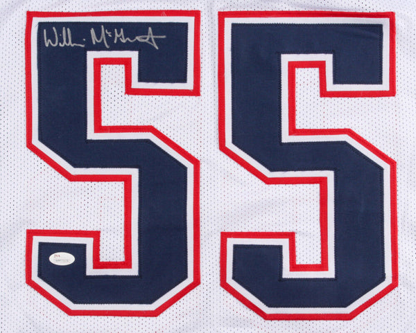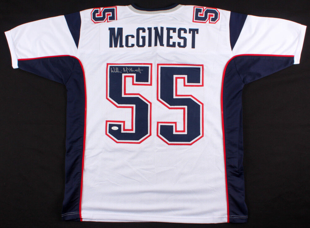 Custom on-field style jersey. Everything sewn on, size XL. Hand-signed in silver felt-tip pen by Willie McGinest. The lot / autograph(s) includes an official James Spence Authentication (JSA) hologram and matching COA for authenticity purposes. The signing of this item was witnessed by JSA.Authentication: JSA COA