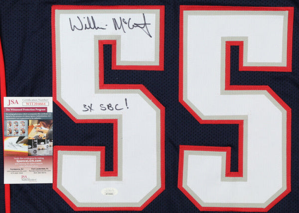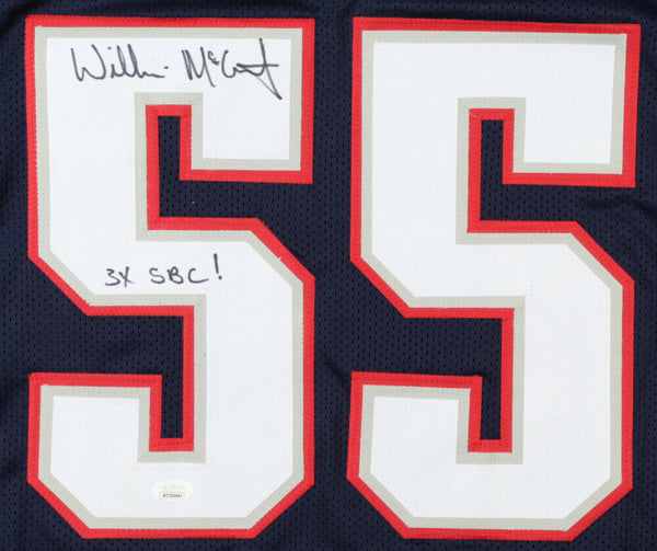 Custom on-field style jersey. Everything sewn on, size XL. Hand-signed in black felt-tip pen by Willie McGinest. The lot / autograph(s) includes an official James Spence Authentication (JSA) hologram and matching COA for authenticity purposes. The signing of this item was witnessed by JSA.Authentication: JSA COA