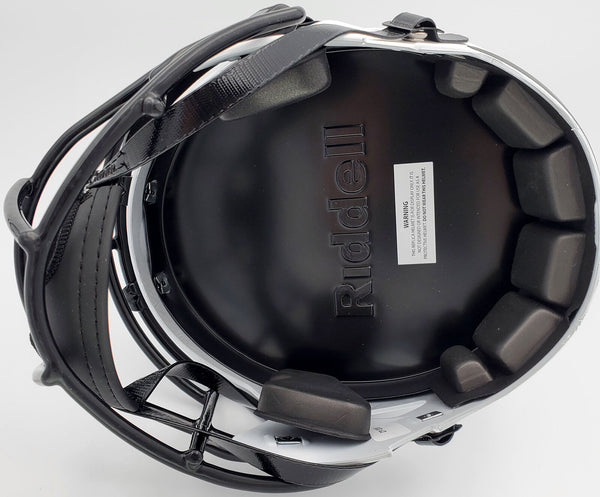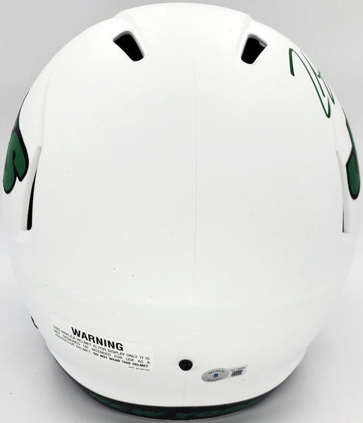 This is a New York Jets Lunar Eclipse White Full Size Replica Speed Helmet that has been hand signed by Zach Wilson. The Eclipse helmets are very delicate and often have some marks or scratches on them. This item has been certified authentic by Beckett Authentication (BAS) and comes with their tamper-proof QR Code sticker that can be verified on the Beckett-authentication.com.