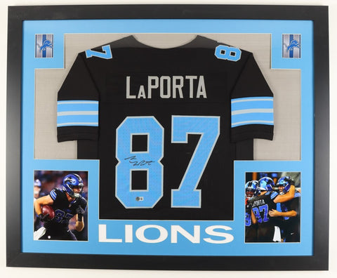 Sam Laporta Signed 35x43 Framed Detroit Lions Jersey (Beckett) 2023 2nd Rnd Pk