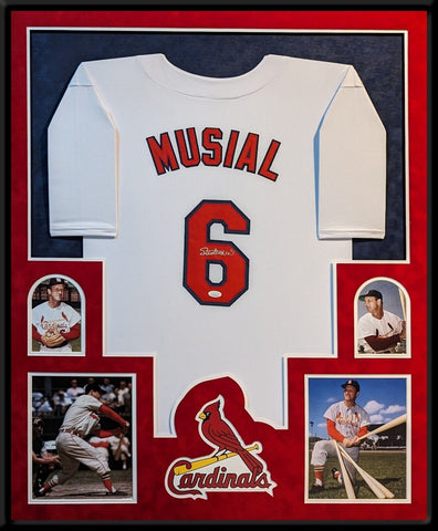 FRAMED IN SUEDE ST LOUIS CARDINALS STAN MUSIAL AUTOGRAPHED JERSEY JSA COA
