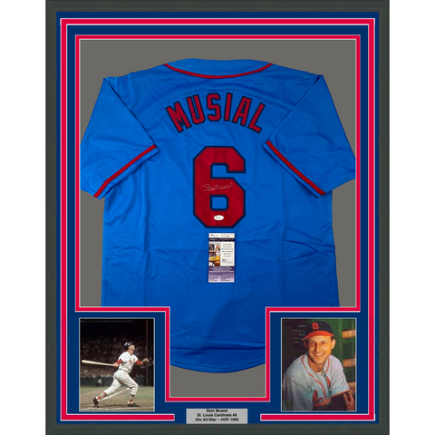 Framed Autographed/Signed Stan Musial 33x42 St. Louis Blue Jersey JSA COA